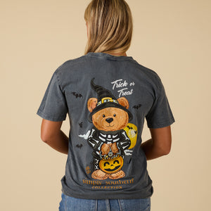 Bring festive charm to your fall wardrobe with the Simply Southern Teddy Candy Short Sleeve Tee. This washed coal gray t-shirt features an adorable teddy bear dressed in a skeleton costume and witch hat, holding a pumpkin candy bucket with “Trick or Treat” lettering. Made with soft cotton fabric and a relaxed fit, this tee is perfect for casual outings, pumpkin patch days, or Halloween night fun.