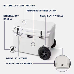 First things first - our nearly indestructible NeverFlat™ Wheels and T-Bar StrongArm™ Handle join forces to offer the most durable, reliable, and comfortable towing design. And just like its predecessors, this Tundra is built with Rotomolded Construction and PermaFrost™ Insulation, so you can trust your contents will stay frosty, even in triple-digit temps.