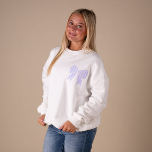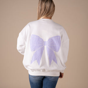 Stay cozy and cute in this Women's Bow Patch Crewneck Sweatshirt in Periwinkle! Featuring an oversized striped bow design on the back and a mini bow on the front, this sweatshirt adds a fun, feminine touch to your casual look.