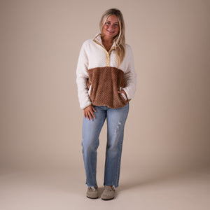 Wrap yourself in cozy comfort with this Colorblock Fleece Pullover. Featuring a soft textured fabric in warm cream and caramel tones, this pullover is designed with a snap-button neckline, chest pocket detail, and side pockets for added function. The plush feel and relaxed fit make it perfect for chilly days, lounging, or casual outings.