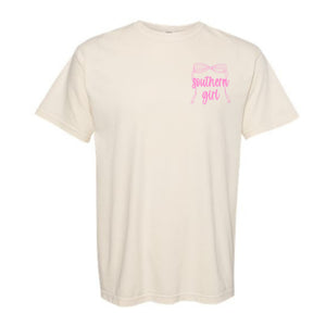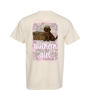 Sweet meets outdoorsy in the Southern Girl Camo Short Sleeve T-Shirt by Dash Forward. This standout graphic tee features a soft neutral base with a bold camo backdrop, topped with a playful bow detail and Southern-inspired design. Finished with a charming dog and hunting scene graphic, it’s the perfect blend of feminine style and country roots.