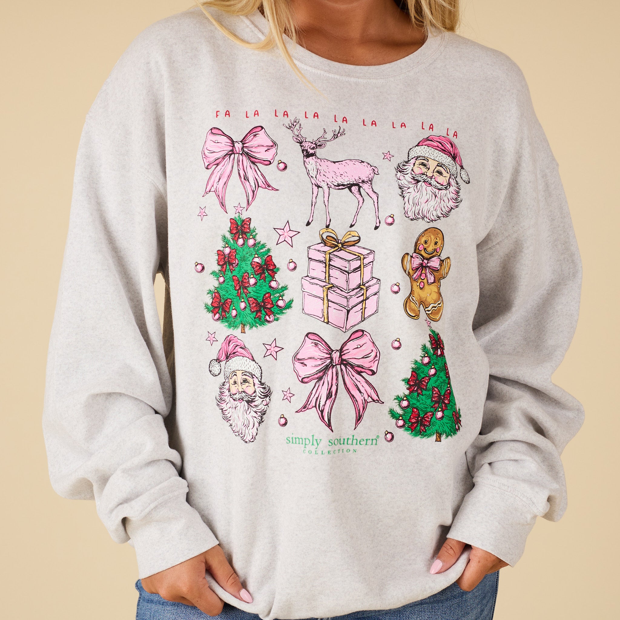 Get into the holiday spirit with the Simply Southern Christmas Grid Sweatshirt. Made from soft, cozy fabric, this heather grey pullover features a playful grid of festive icons including pink bows, Santa faces, Christmas trees, reindeer, gingerbread, and wrapped presents. The design is accented with pops of pink, green, and red, along with the phrase “Fa La La La La” across the top. Perfect for layering or lounging, this cheerful sweatshirt makes holiday dressing both comfy and fun.