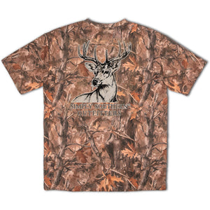 Camo short sleeve shirt with a large deer and the Simply Southern logo below. Similar design on left chest.