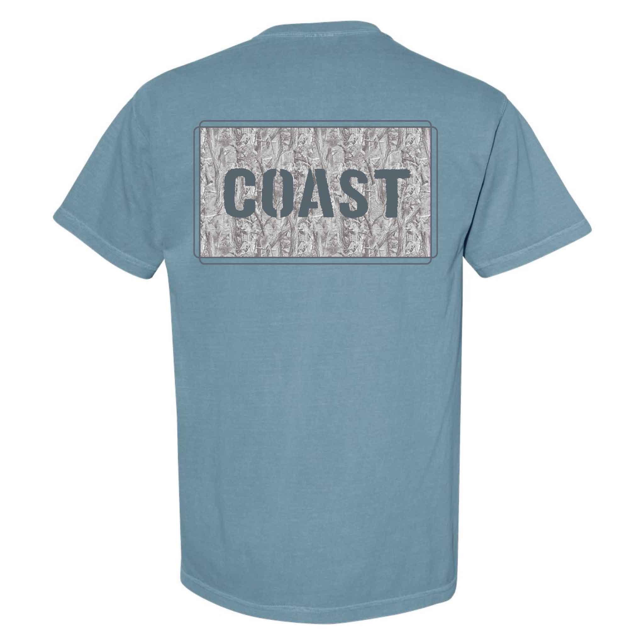 The front features a classic chest pocket with a COAST logo, while the back showcases a bold box graphic filled with a textured camo pattern and large COAST lettering. The cool ice blue color adds a clean, coastal feel that pairs perfectly with shorts, swim trunks, or jeans.