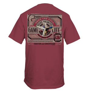 Celebrate tradition, conservation, and Gamecock pride with the Carolina Ducks Unlimited Game Life T-Shirt. This garnet short sleeve tee features a small Ducks Unlimited and Carolina logo on the front and a bold, full-color back graphic with a flying duck, “Game Life” slogan, and “Heed the Call” banner. Perfect for gamedays, outdoor adventures, or everyday wear.