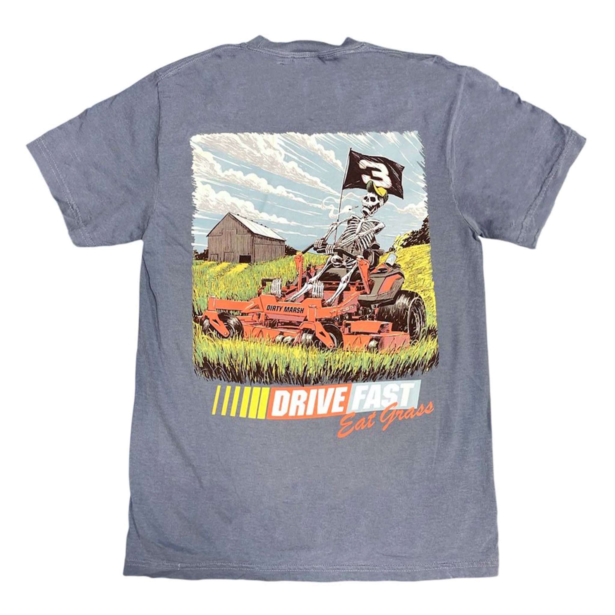 The Drive Fast, Eat Grass Tee features our iconic Dirty Marsh skeleton ripping a lawn mower like it’s race day. It’s a nod to everything sacred — Nascar, fresh-cut lines, and... that third thing we can’t legally say.