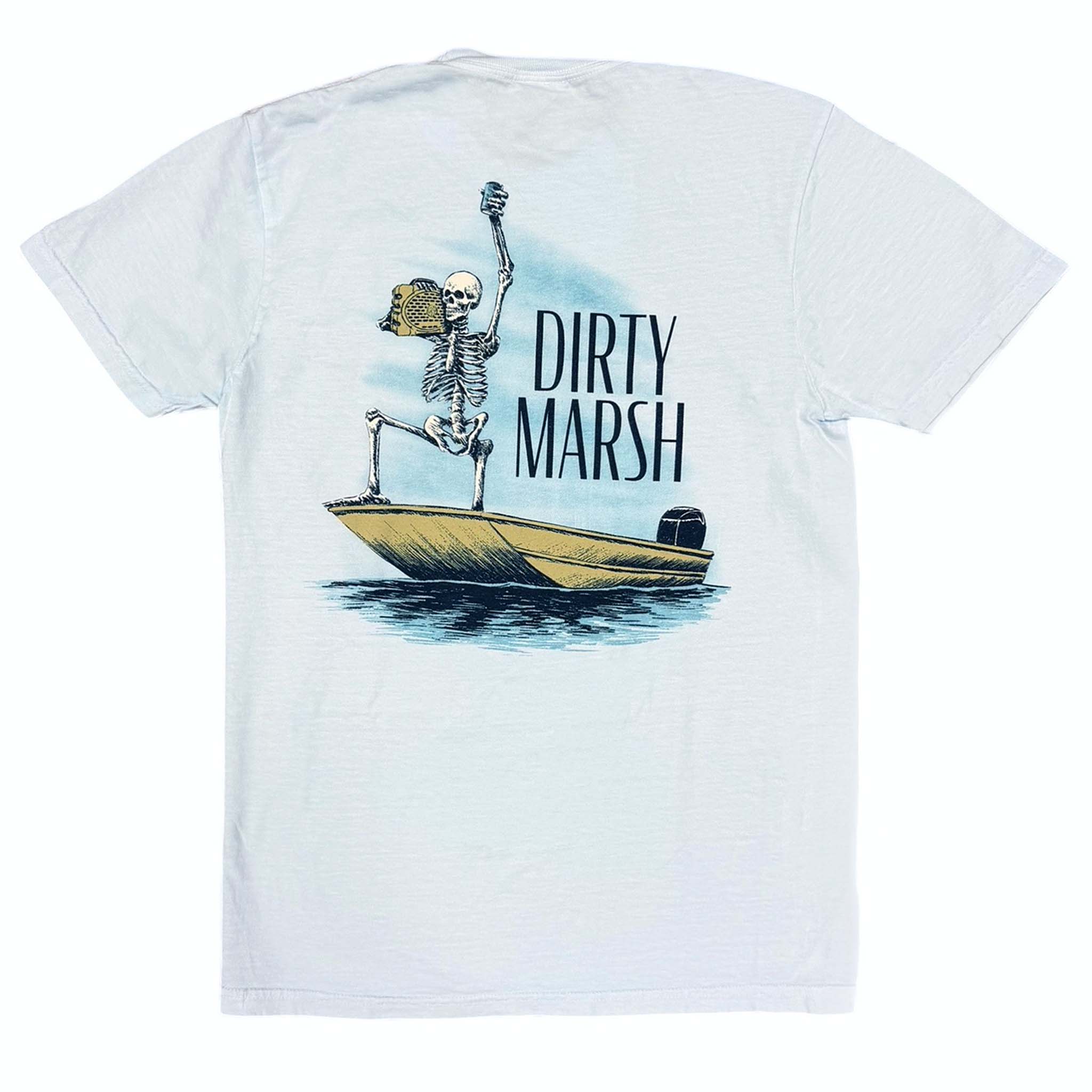 Bring a bold, carefree vibe to your everyday lineup with the Dirty Marsh Speaker Skelly Short Sleeve T-Shirt. Featuring a standout graphic of a skeleton posted up on a boat with a speaker in hand, this tee captures the fun, laid-back energy of long days on the water and good times with friends.