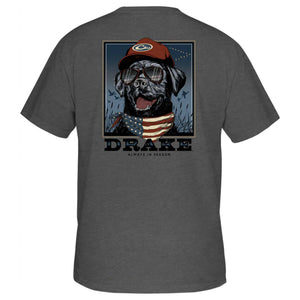 The Drake Waterfowl Graphic Tee is constructed with a 60% cotton and 40% polyester blend, which supplies softness and comfort. It has a Drake duck head logo on the front pocket and depicts a Lab with an American Flag bandana from our Americana Drake Series of graphic tees.