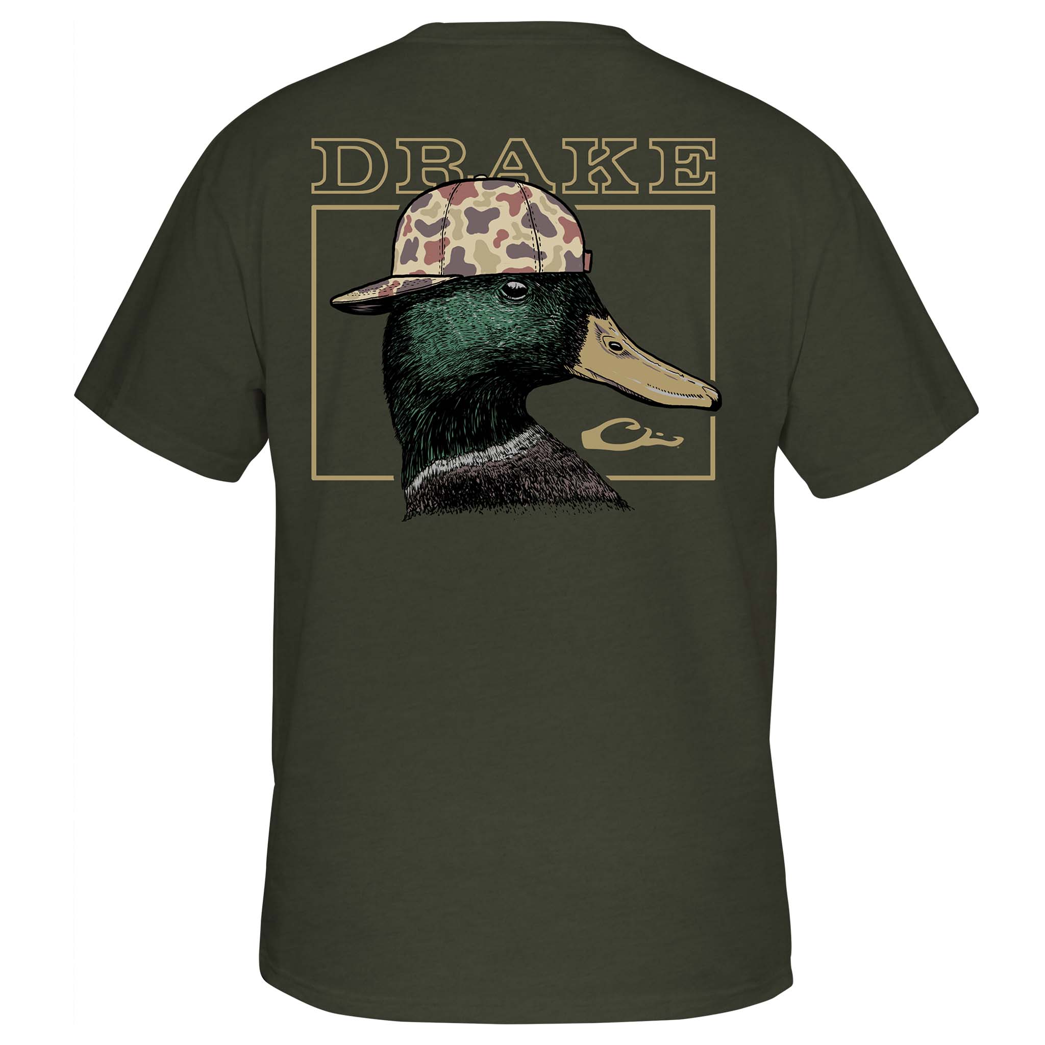 The Drake Short Sleeve Graphic Tee is constructed from a 60% cotton and 40% polyester blend, providing softness and comfort. The Drake BCM has the Drake Logo on the front pocket and the Drake Back Cap Mallard graphic on the back from our Ducks of Drake Series of back graphic tees.