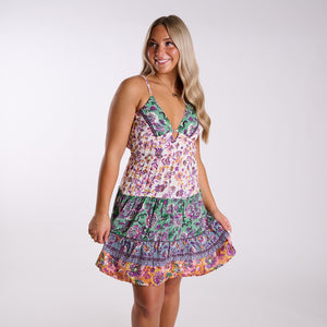 Feminine, flirty, and full of color — the Angie Dress is your new go-to for brunch dates, beach vacations, and sunny days out. Designed with a vibrant mixed floral print, this tiered mini dress features a flattering deep V-neckline with a subtle front keyhole detail and adjustable spaghetti straps for the perfect fit.
