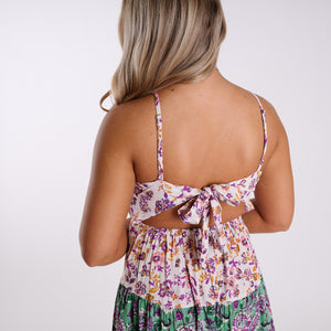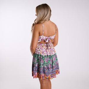 The open-back design ties into a bow for a playful, romantic touch while allowing for customizable comfort. A smocked waist creates a flattering silhouette, and the tiered skirt adds effortless movement with every step.