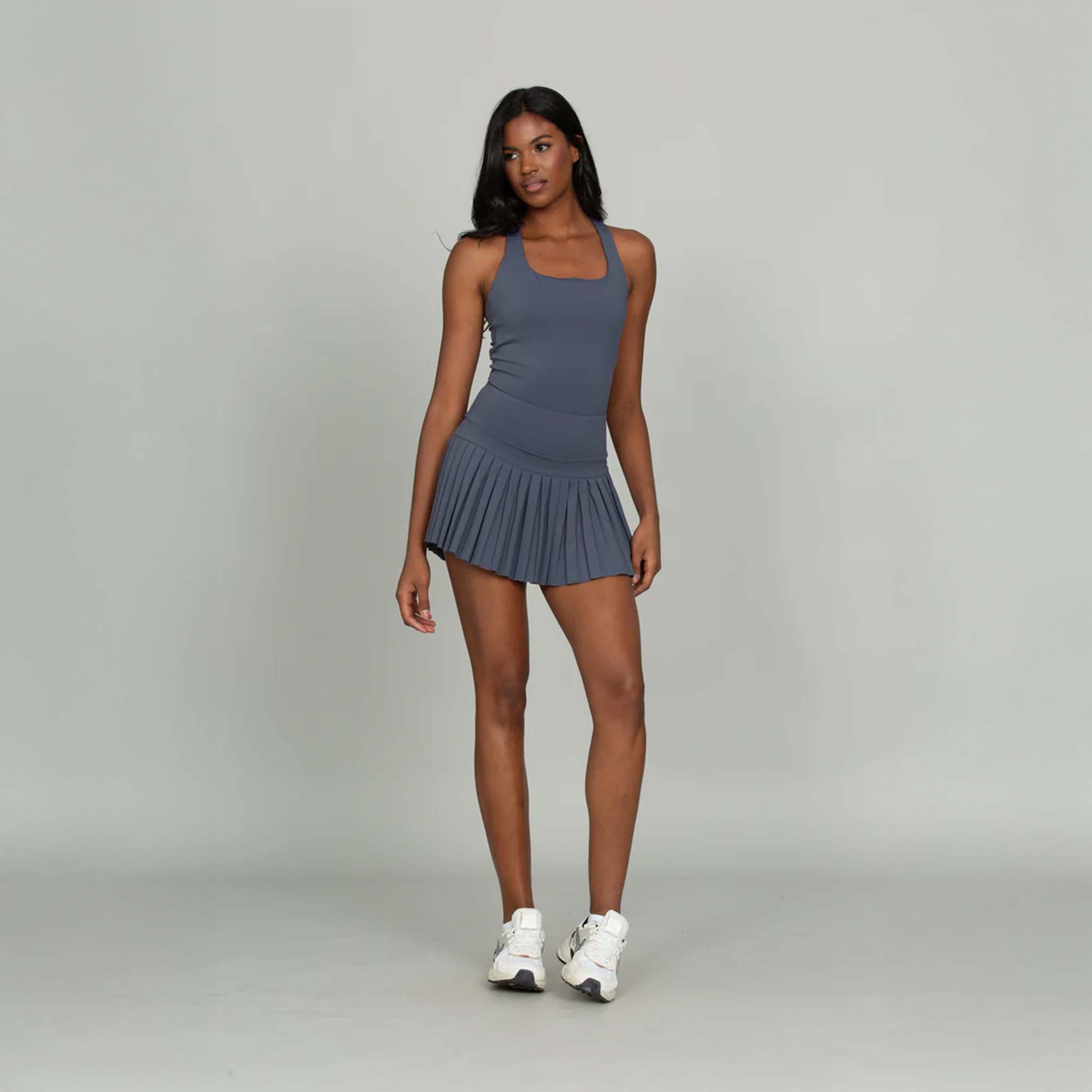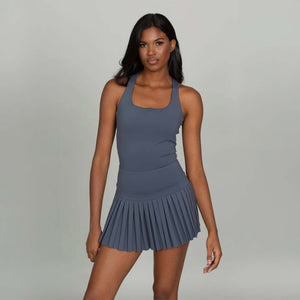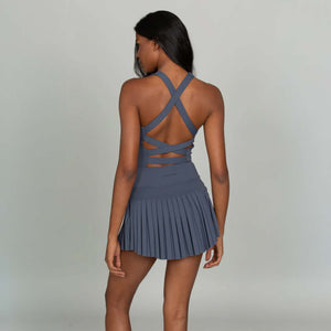 Elevate your court-to-street style with the Gold Hinge Strappy Tennis Dress. Featuring a flattering square neckline, pleated skirt, and an eye-catching strappy open back, this dress blends sporty function with feminine detail. Built-in shorts with pockets add all-day comfort and convenience, making it perfect for tennis, pickleball, or casual outings.
