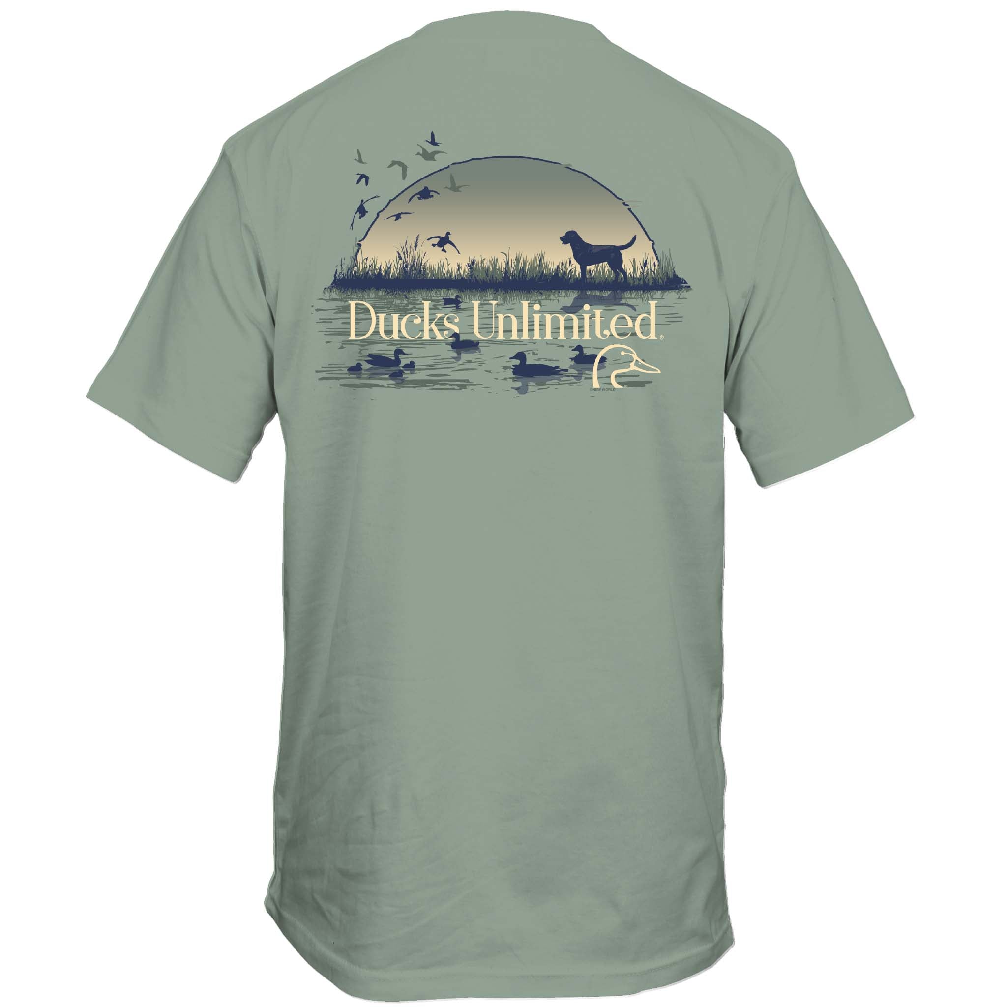 The front features the classic Ducks Unlimited duck head logo positioned on the upper chest, while the back showcases a breathtaking wetland scene that tells the story of conservation in action. The back design features a serene circular vignette depicting ducks swimming peacefully in wetland waters, with marsh grasses silhouetted against a golden sunset sky. A hunting dog stands alert on the shoreline as waterfowl take flight overhead, creating a complete outdoor scene that resonates with hunters and conservationists alike.