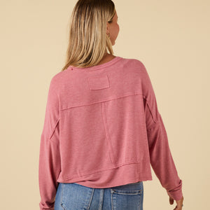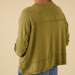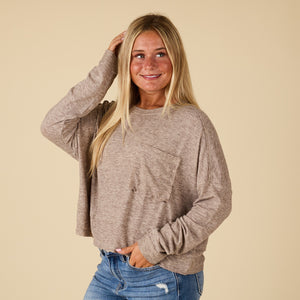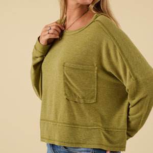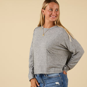 Effortless style meets everyday comfort in the Long Sleeve Relaxed Pocket Top. Designed with a slouchy silhouette and lightweight fabric, this top is perfect for layering or wearing on its own. A front chest pocket and raw seam detailing give it a laid-back, lived-in feel, while the drop shoulders add a relaxed touch. Pair with jeans or leggings for the ultimate casual look.