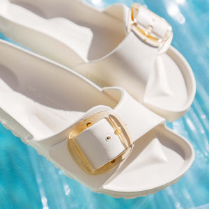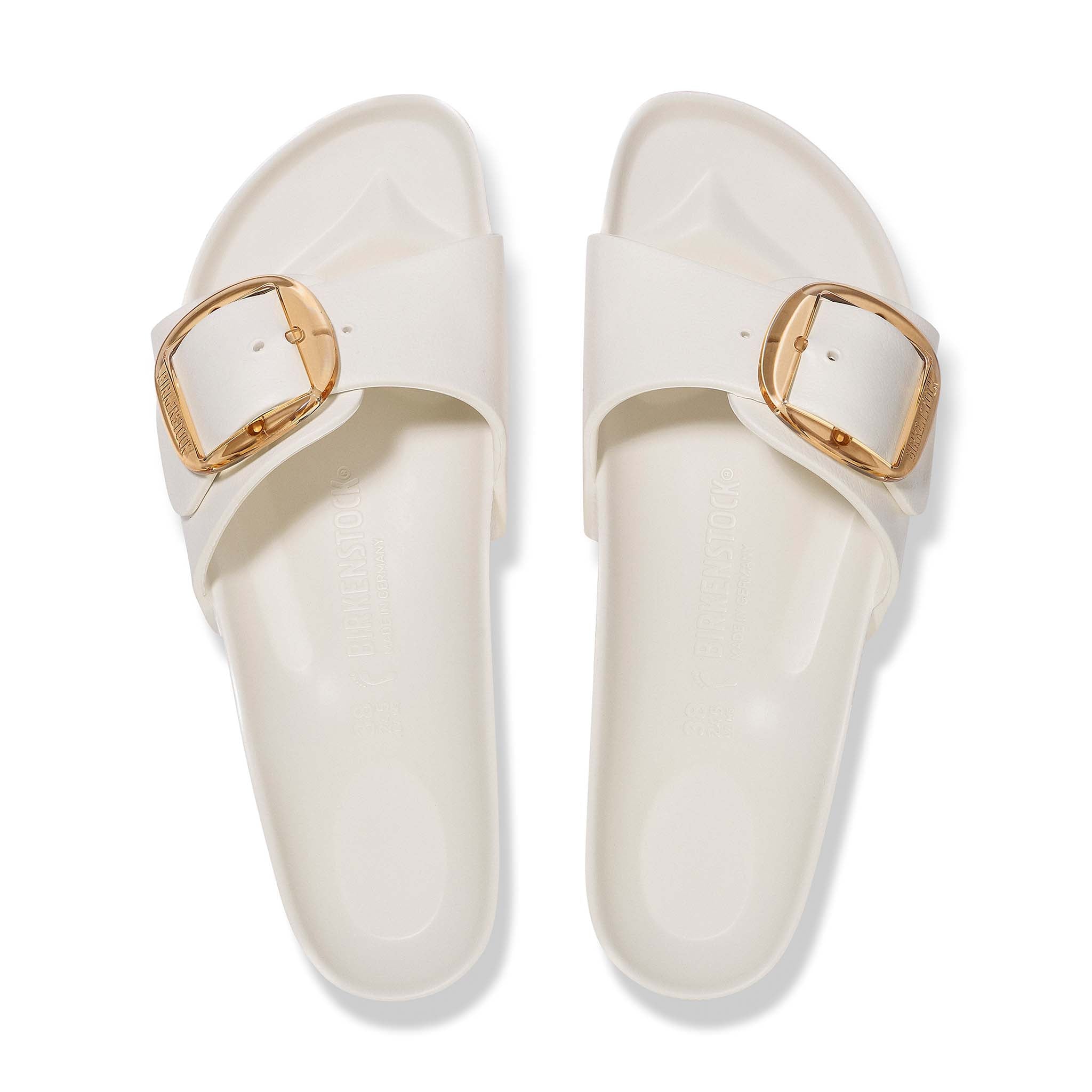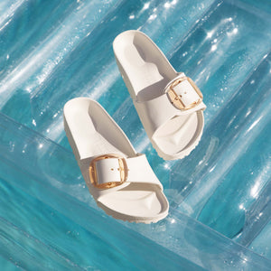 This is a new and modern interpretation of the BIRKENSTOCK classic Madrid. This version features our popular Big Buckle made from a stainless synthetic material and makes an impression with its durability and minimalist design. Modeled on the cork sandal, it is made from the ultra-lightweight and highly flexible synthetic material EVA. The high-quality, odor-neutral EVA has been tested for harmful substances and combines numerous positive attributes: it is very light, highly elastic, shock-absorbent, water-resistant, and skin-friendly.