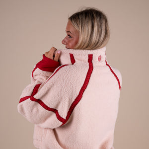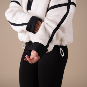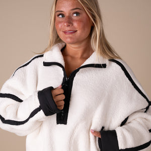 Cozy fleece pullover featuring a half-zip closure and high neckline with bold contrast seams throughout and an adjustable hemline.