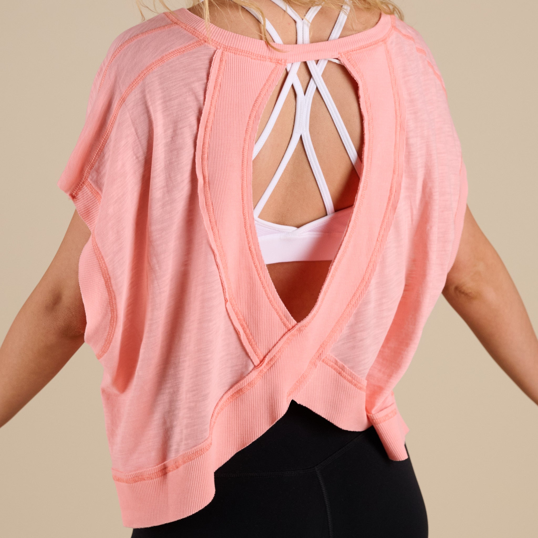 Make your next move in this light and airy layering tee featured in a slouchy design with a wrapped cutout back that’ll keep you cool through all your workouts.