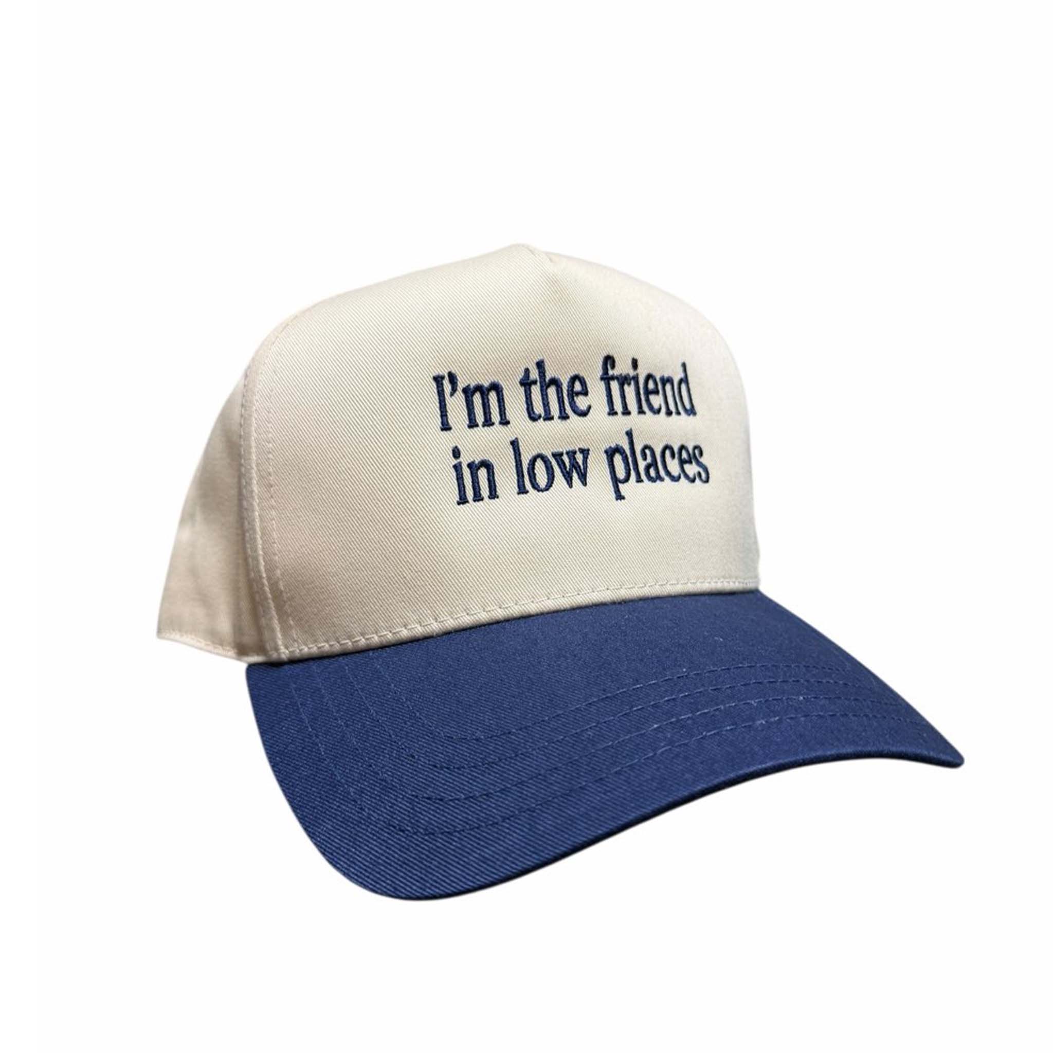 Bring a little country humor to your everyday style with this “I’m the friend in low places” trucker hat. Featuring a cream front panel with bold navy embroidery and a matching navy bill, it’s the perfect laid-back accessory for concerts, tailgates, and casual outings.