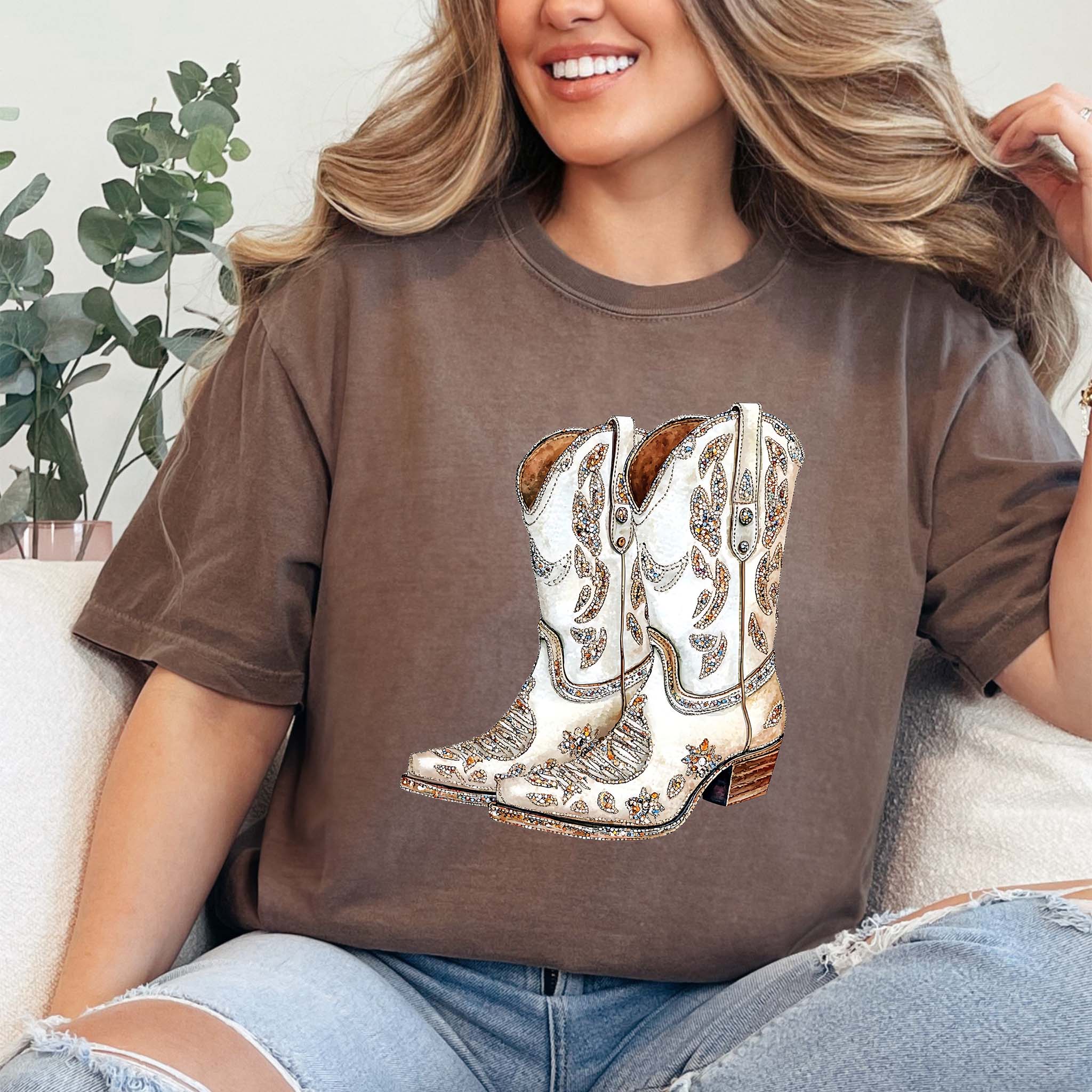Saddle up in style with this western-inspired graphic tee. Featuring white embellished cowboy boots on an espresso backdrop, it's the perfect blend of country glam and everyday comfort.