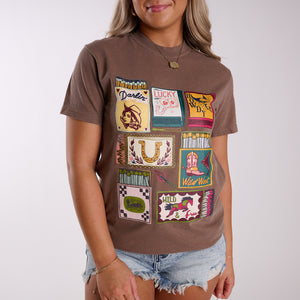 Make a bold statement with the Western Matchboxes Short Sleeve T-Shirt by Dash Forward. Featuring a colorful, retro-inspired matchbox collage design, this tee adds personality and artistic flair to any casual outfit.