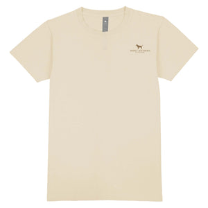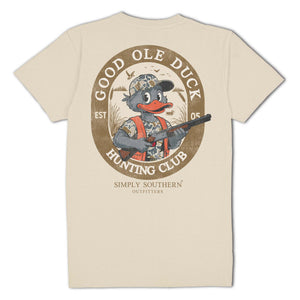 Wisp tan short sleeve shirt with the phrase 'Good ole duck hunting club' and a duck preparing to go hunting. Simply Southern logo below and on left chest.
