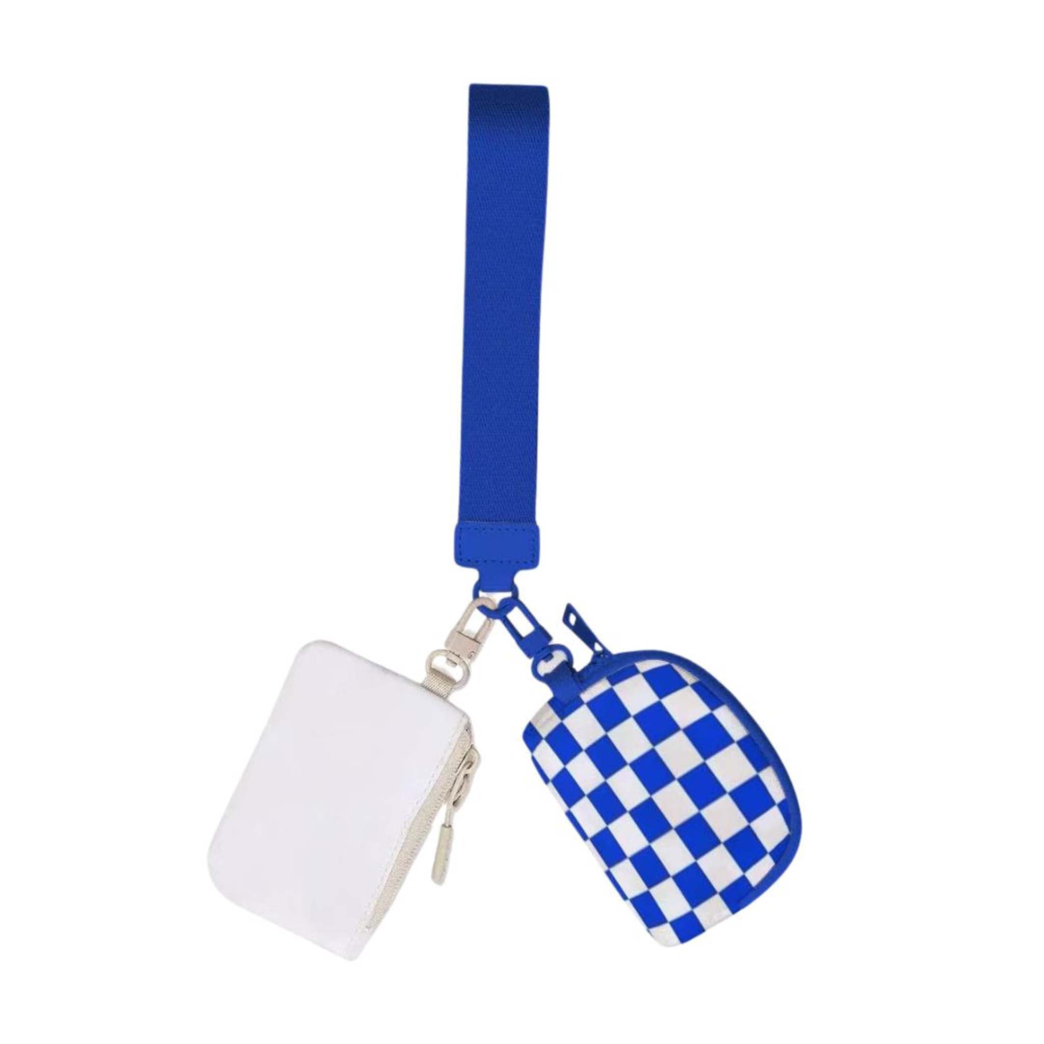 Add a pop of style and convenience to your everyday carry with this dual mini pouch wristlet. Featuring a bold royal blue wrist strap, this accessory includes two detachable zip pouches—one in crisp white and the other in a vibrant blue-and-white checkerboard pattern. Perfect for stashing small essentials like cash, cards, earbuds, or keys, this lightweight wristlet keeps your items secure and within reach. The detachable design lets you use the pouches together or separately, making it a versatile grab-and-go solution for any outing.