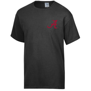 Black short-sleeve T-shirt with crimson Alabama “A” logo on front and back