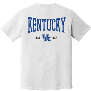 Celebrate your Wildcat pride in classic style with this Kentucky Comfort Colors T-Shirt. Crafted from ultra-soft, garment-dyed cotton, this short-sleeve tee features the UK logo on the front chest and a bold “Kentucky” graphic with “Est. 1865” printed across the back. Its relaxed fit and lived-in feel make it the perfect everyday shirt for fans, students, and alumni alike.