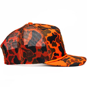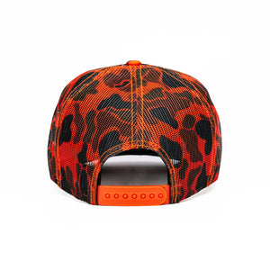 The Highway 40W Orange Duck Camo Trucker Snapback Hat brings bold camo energy to your everyday hat lineup. Featuring vibrant orange duck camouflage and a black and orange rubber patch, this foam-front trucker hat offers a retro-inspired look with rugged outdoor attitude. Finished with a pre-curved bill and adjustable snapback, it's the perfect statement piece for hunting trips, lake days, and weekend hangs.