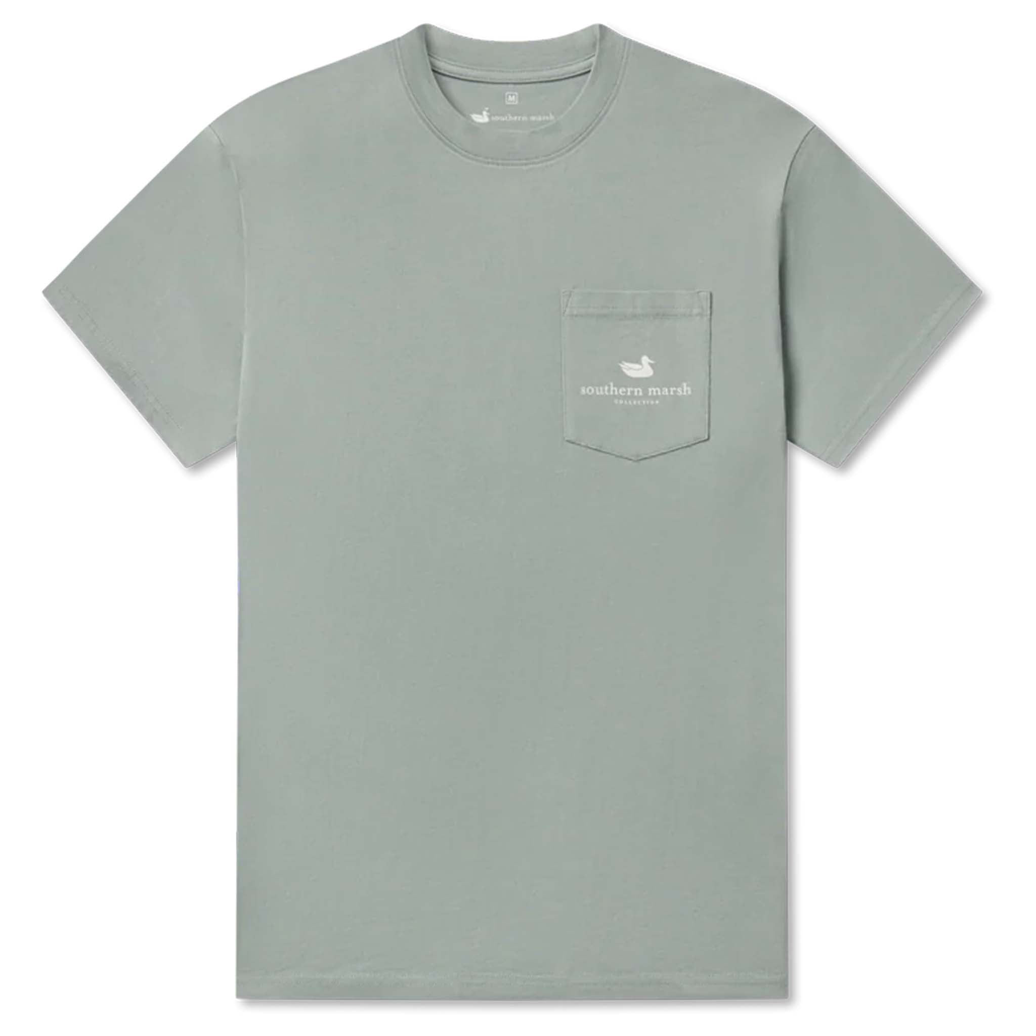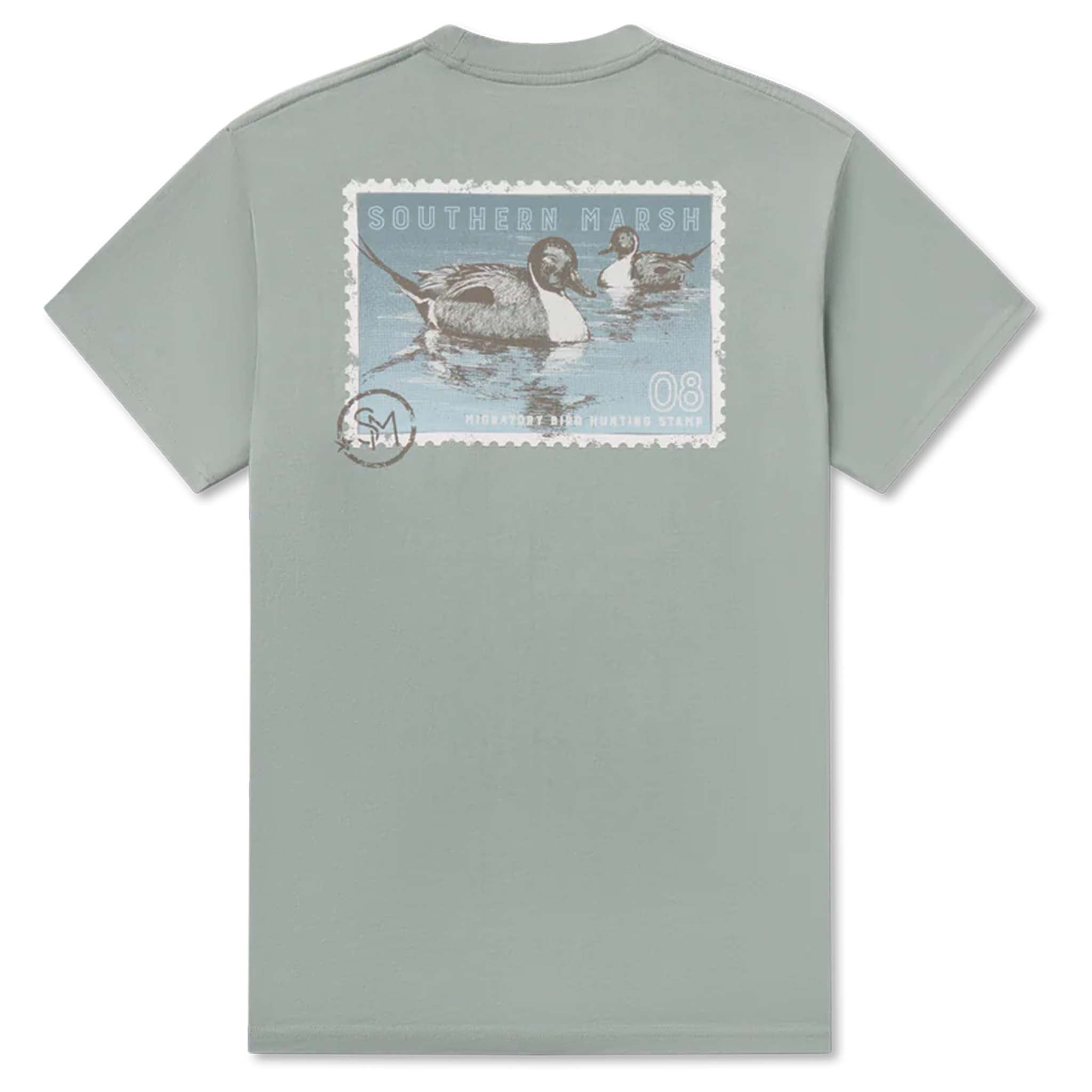 Federal Duck stamps were created to protect the habitats of birds and other wildlife. The short sleeve Duck Stamp Pintail Tee is a nod to this conservation stamp and features a vintage custom design with two swimming pintail ducks on the back.  Southern Marsh's comfortable cotton tees have a handy front pocket and come with a printed neck tag for added comfort.