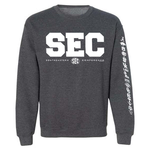 Rep your conference pride with the SEC Conference Crewneck Sweatshirt. This charcoal grey pullover features a bold "SEC" logo across the chest, with the full Southeastern Conference spelled out beneath. The standout detail is on the sleeve—where each member school’s logo is displayed, from Alabama and Georgia to LSU, Tennessee, Florida, and more. Made with a soft cotton blend for all-day comfort, this sweatshirt is perfect for gamedays, tailgates, or casual wear.