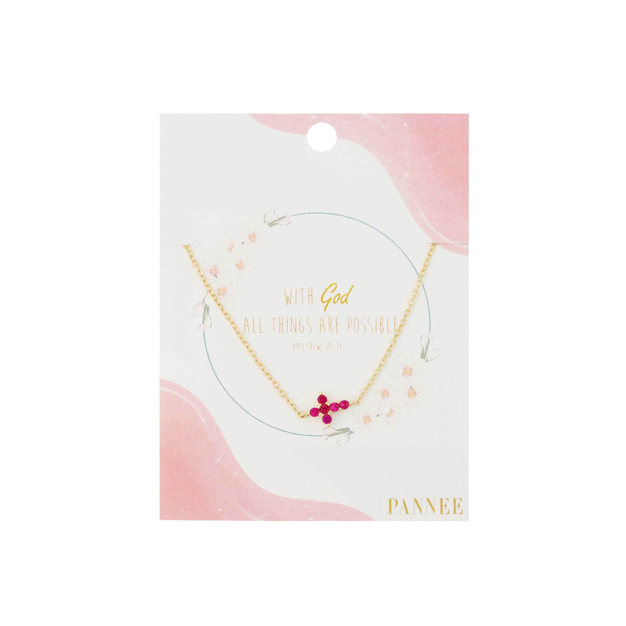Simple, elegant, and full of meaning—this Pannee necklace features a sparkling pink crystal cross pendant on a dainty gold chain. Displayed on an inspirational card with “With God All Things Are Possible,” it makes a thoughtful gift of encouragement or faith.