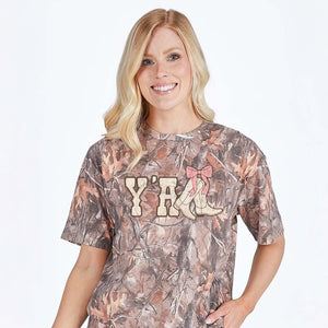 Southern style meets outdoor flair in this Simply Southern camo graphic tee. Featuring an allover realistic camo print and bold “Y’ALL” lettering accented with cowgirl boots and a pink bow detail, this shirt blends country charm with feminine touches.