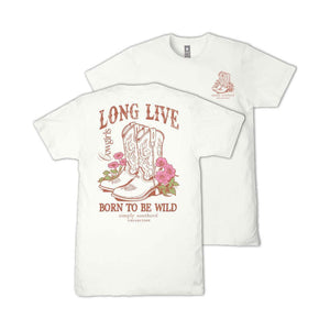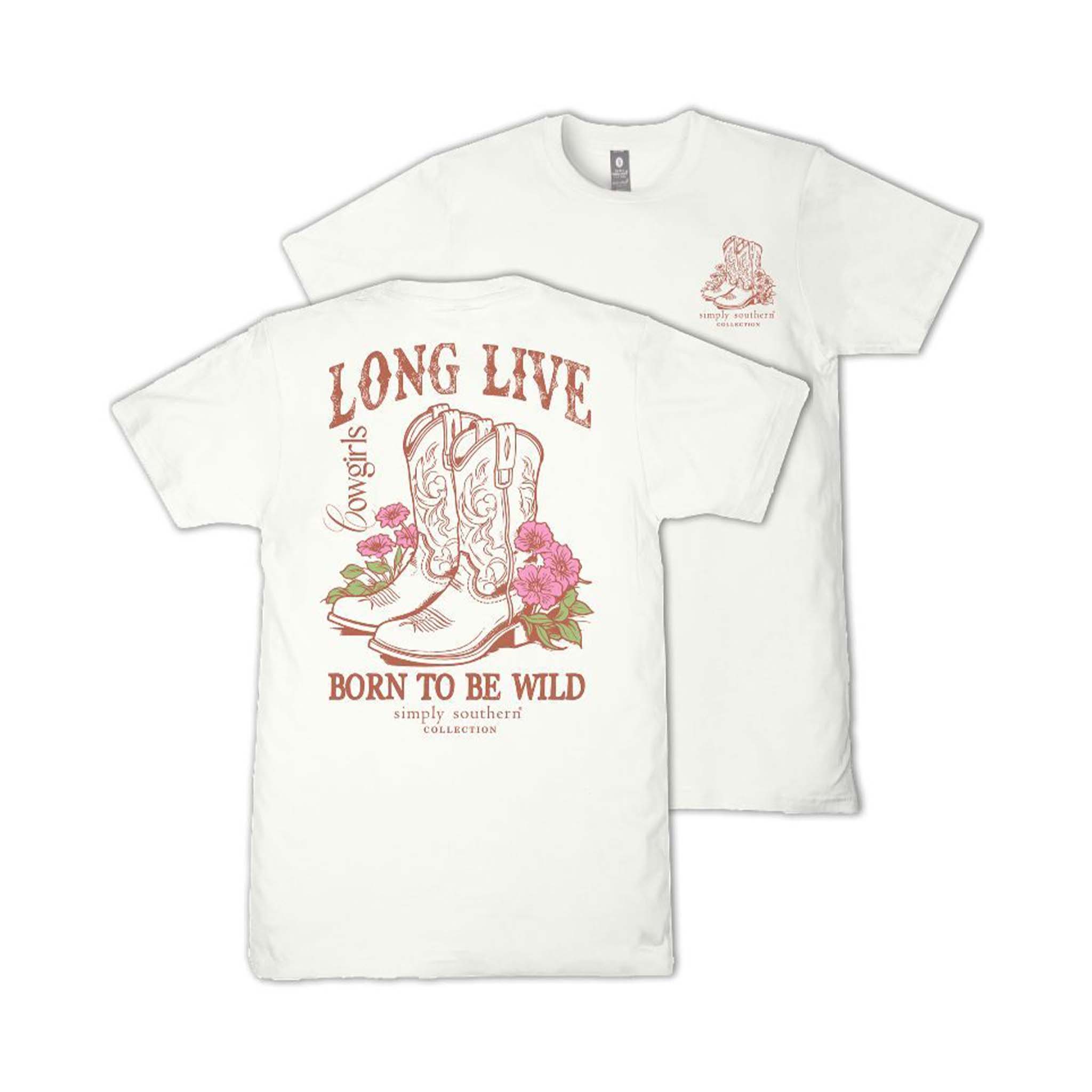 Let her show off her western spirit with the Youth Long Live Cowgirls Short Sleeve T-Shirt by Simply Southern. This charming tee features a soft, comfortable fit with a bold back graphic of classic cowgirl boots surrounded by florals and the phrase “Born to Be Wild.” Finished with a subtle front chest graphic, it’s perfect for everyday wear, school days, or weekend adventures.