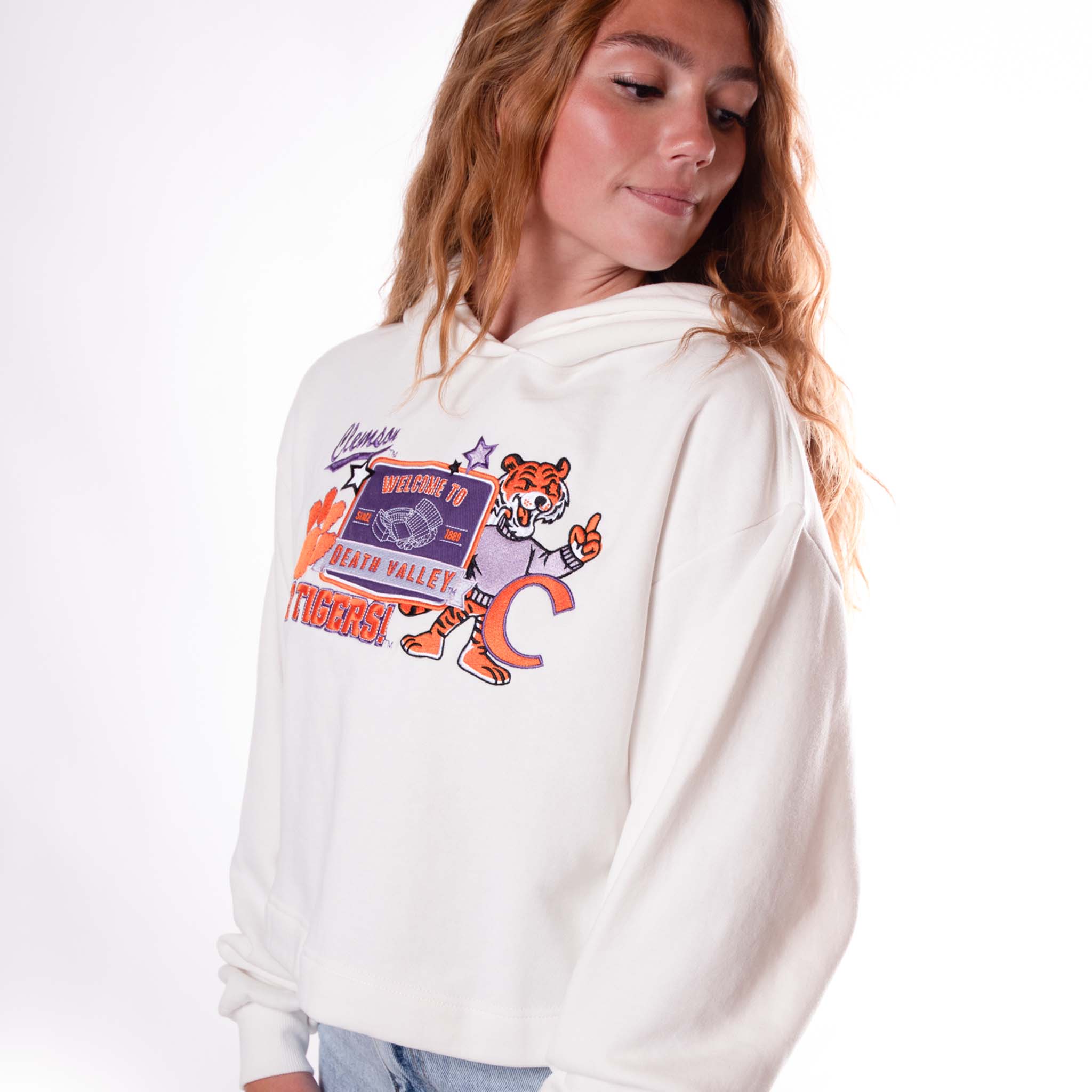 Show your Tiger pride in style with this cropped white hoodie featuring a bold, layered Clemson patch design. Perfect for game day or everyday wear, this hoodie offers a cozy fit with spirited graphics that make a statement.