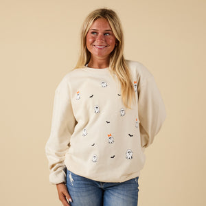 Get in the spooky spirit with this cozy ghost print sweatshirt. Designed in a soft sand color, this crewneck features playful ghost graphics with orange bows and tiny black bats scattered across the front. The relaxed fit makes it perfect for layering over your favorite jeans or leggings for a casual Halloween look that’s both festive and comfortable.