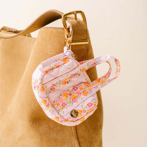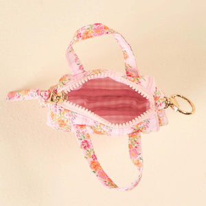 This pretty pink floral mini duffle keychain adds a pop of color and charm wherever you go. With a quilted body, soft stripes, and a blooming floral print in vibrant pinks and oranges, it’s both playful and practical. The zippered top reveals a pink gingham lining and just enough room for your tiny must-haves.