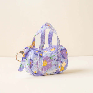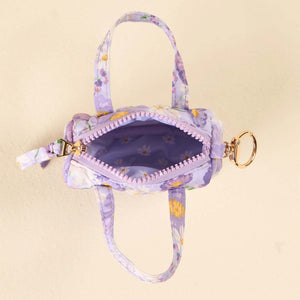 Add a pop of floral charm to your bag or keys with this adorable mini duffle keychain! This quilted keychain purse features a purple and yellow flower print, gold-tone hardware, and a secure zip closure—perfect for holding small essentials on the go. Clip it to your tote, backpack, or use it as a stylish standalone accessory.
