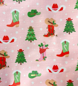 Tote-ally amazing! 🛍 Celebrate the season Western-style with festive cowboy boots, hats, and Christmas trees dancing across a soft pink background.