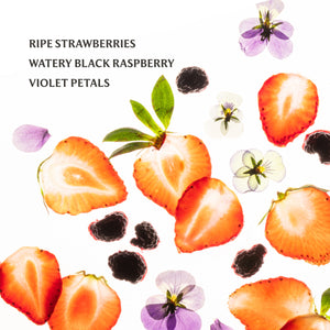 Meet Berry Bliss. Lush and joyful. Ripe strawberries and juicy black raspberry blend with violet petals, capturing the brightness of a berry-kissed meadow.
