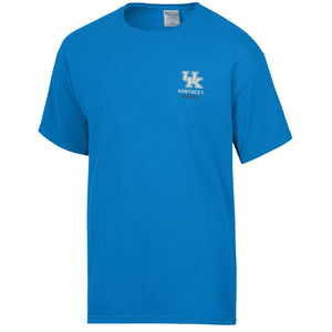 Show your Wildcat pride in this University of Kentucky football t-shirt! Featuring a small UK Football logo on the front and a bold graphic on the back with a football design, checkerboard background, and “Big Blue Country” wording, this tee is a game day essential. Made with soft cotton and a classic crew neckline, it’s perfect for tailgates, Kroger Field, or cheering from home.