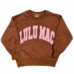 Add a pop of personality to your everyday layers with this Lulu Mac crewneck sweatshirt. Featuring bold LULU MAC collegiate lettering in soft pink against a rich brown backdrop, this sweatshirt delivers cozy comfort with standout style. Designed with a relaxed fit, ribbed cuffs, and a classic crew neckline, it’s perfect for casual days, cool evenings, and effortless outfit styling.