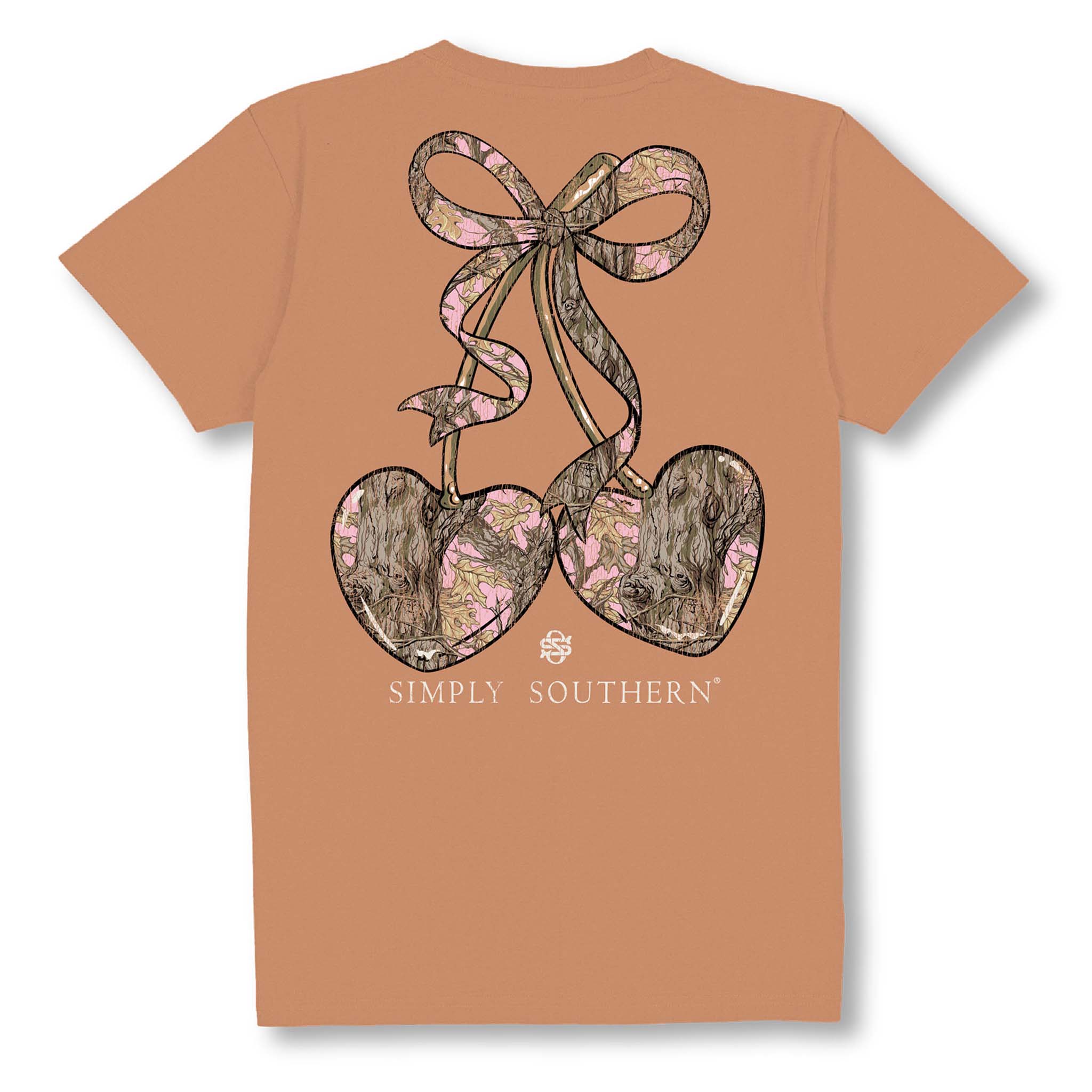 Show your love for southern charm and the outdoors with the Simply Southern Camo Heart Bow T-Shirt. This chestnut-colored tee features a back graphic of two camo-patterned hearts tied together with a bow, accented by hints of pink floral details. The front is simple with a small bow graphic on the chest for a subtle touch. Comfortable and stylish, it’s perfect for casual wear year-round.