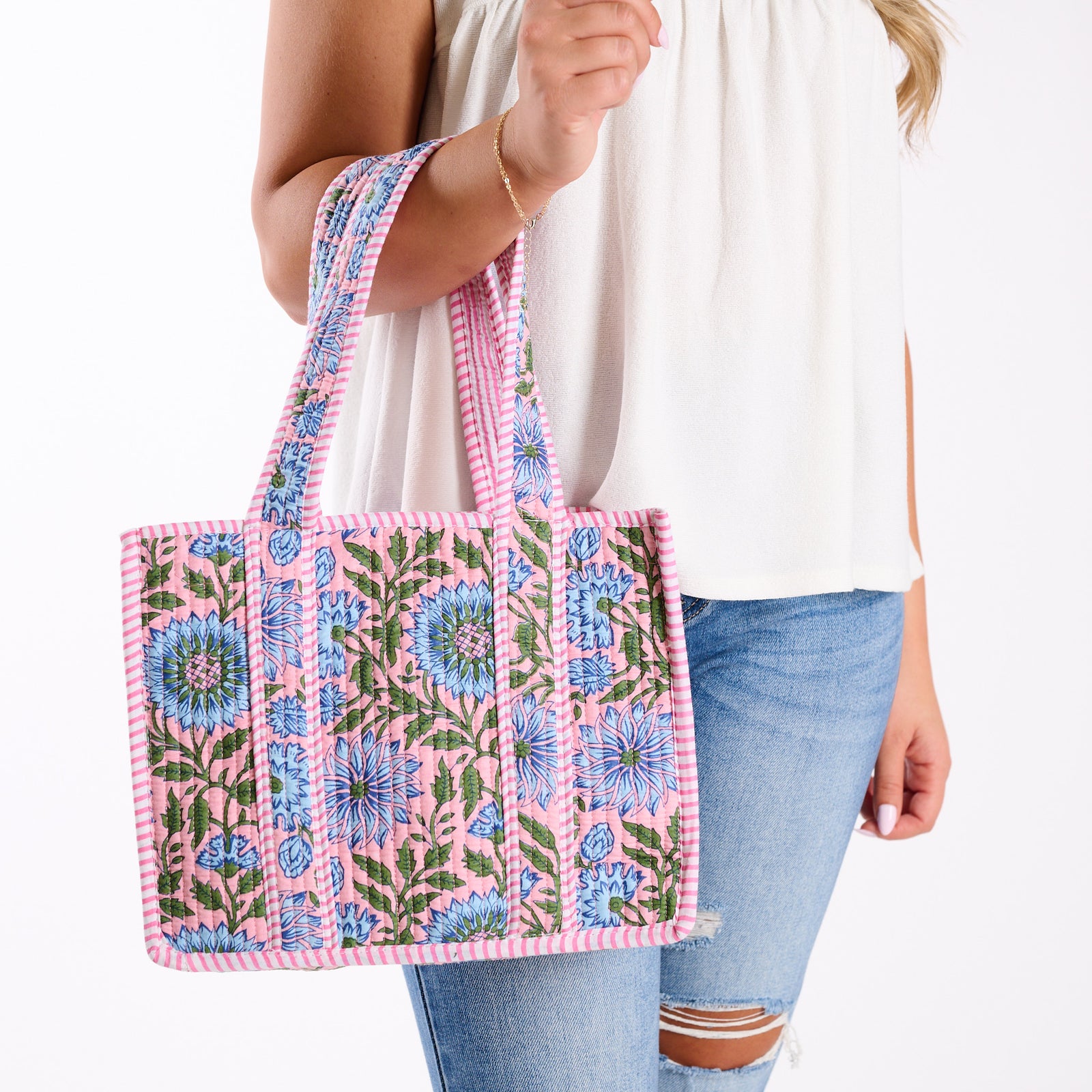Mini White Floral Quilted Tote Bag