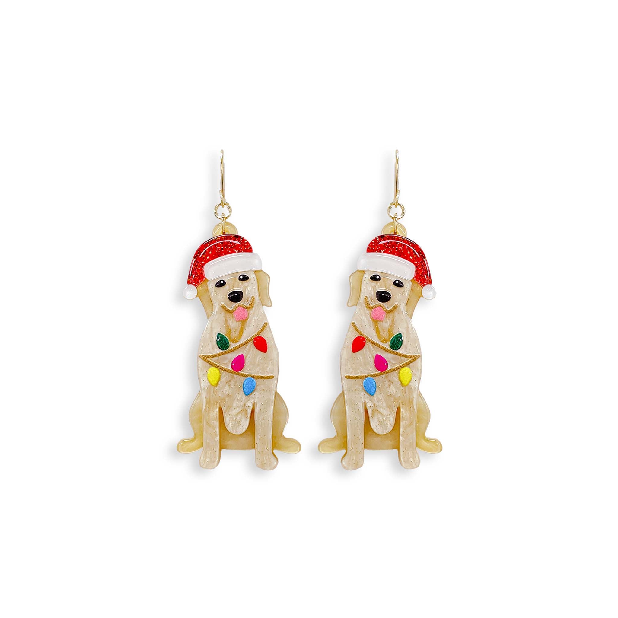 Get into the holiday spirit with these cheerful golden dog earrings wrapped in colorful Christmas lights. Topped with a sparkly Santa hat, these lightweight acrylic earrings make a fun and festive statement for the season.