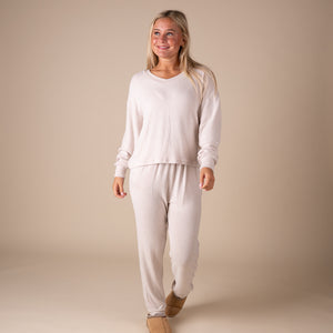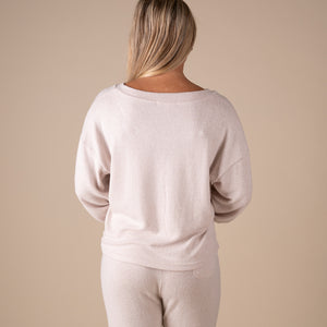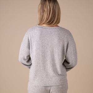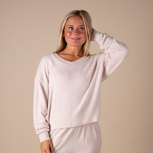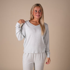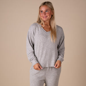 Elevate your relaxation game with our V-Neck Hacci Long Sleeve Loungewear Top. Crafted from ultra-soft Hacci fabric, this top offers the perfect blend of comfort and style.