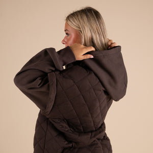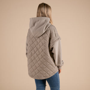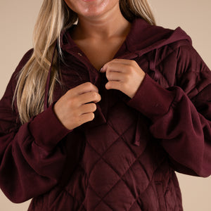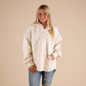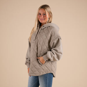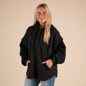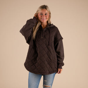 Cozy up in style with this quilted hooded pullover, designed for effortless comfort and everyday wear. The soft quilted body adds warmth without bulk, while the relaxed sleeves and roomy hood give it that perfectly laid-back feel. Finished with snap-button detailing and a front kangaroo pocket, it’s the ideal throw-on layer for chilly days, casual outings, or lounging at home.