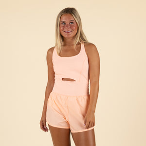 The perfect one-and-done running outfit, this easy romper features a slim-fitting top with a cooling cutout at the center paired with airy retro-style shorts.