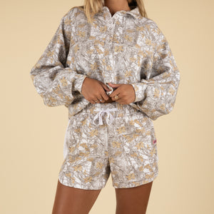 Stay cool and comfortable with these women’s drawstring shorts, designed in a soft tan, white, and gray camo print. Featuring an elastic waistband with adjustable drawcord for the perfect fit, these shorts include breathable white mesh side panels for added comfort and mobility. Side pockets offer convenient storage, while the lightweight fabric makes them ideal for warm days, casual outings, or layering over swimwear.