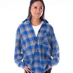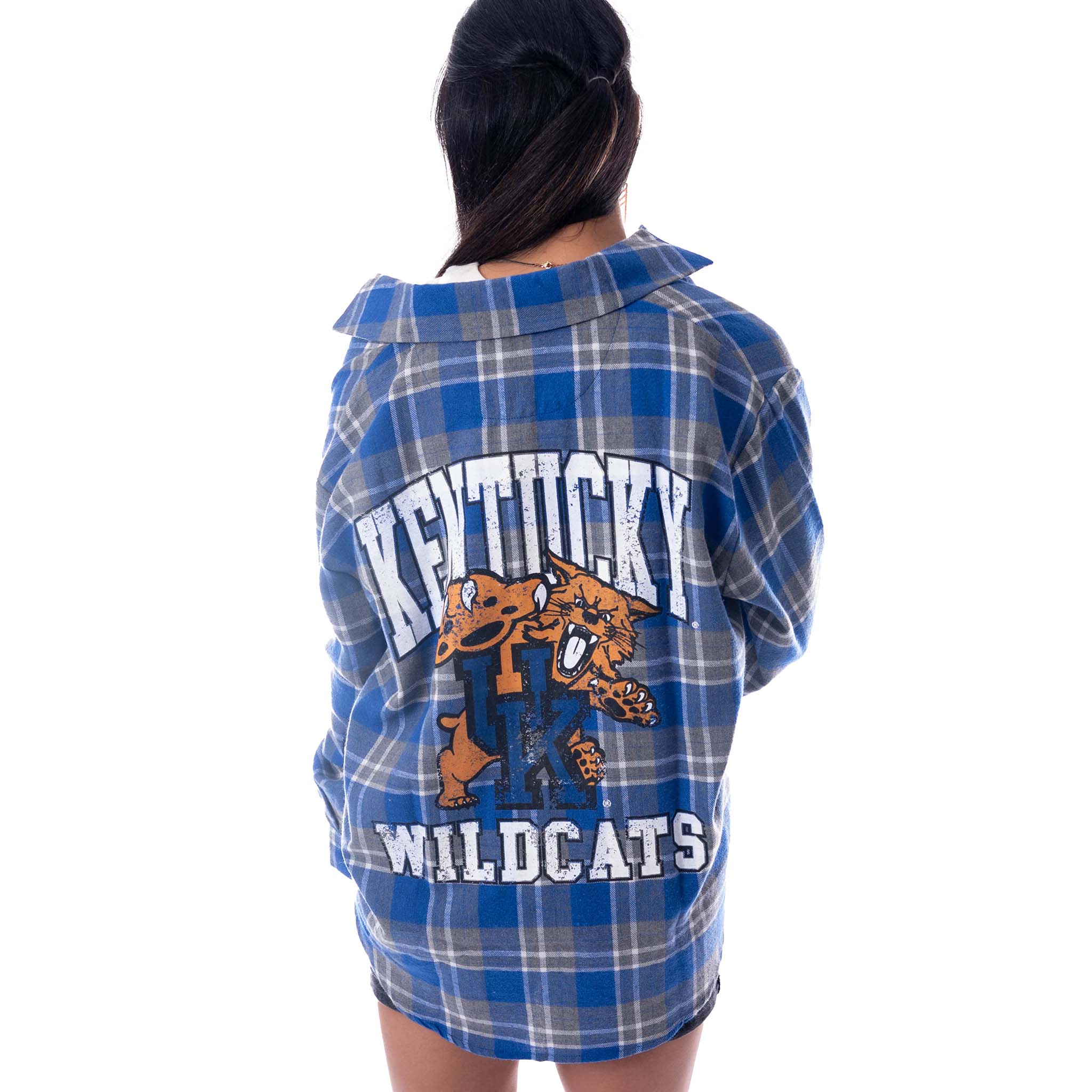 Cheer on the Wildcats in laid-back style with this Kentucky flannel shirt. Featuring a classic blue and grey plaid pattern, this button-front layer offers an oversized fit for all-day comfort. The standout back graphic showcases the bold “Kentucky Wildcats” logo with the iconic wildcat mascot, making it perfect for gameday or casual wear.